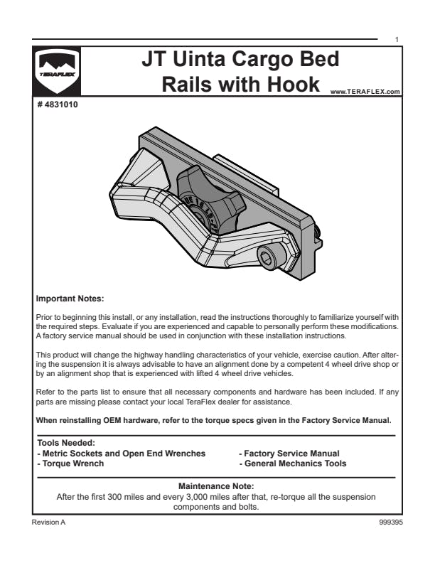 Secure your toys in the bed of your JT Gladiator pickup with our innovative TeraFlex JT: Unita Cargo Bed Rail System w/ Tie-Down Anchors. Aluminum rails feature an attractive black powder coat finish for durability. Includes the front rail and two side rails as well as four Uinta Cargo Tie-Down Anchors. Uinta Cargo Tie-Down Anchors are constructed from a combination of stainless-steel and anodized aluminum for good looks and durability making them much stronger than the plastic alternatives. Compatible with the TeraFlex Uinta Cargo Bed Rail System as well as the Mopar Bed Side Rails. More accessories are planned.